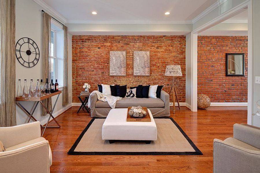 Гостиная с кирпичными стенами может стать гораздо более визуально привлекательной, а мебель в нейтральных тонах станет заметнее.