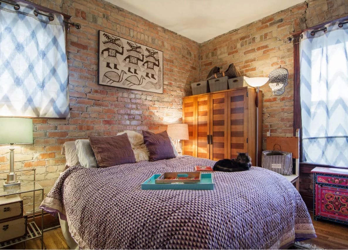 Если ты предпочитаешь современные эклектичные стили, то кирпичная стена у изголовья кровати создана специально для тебя. Установи вдоль нее длинные асимметричные и хаотичные полки. Расставь там приятные мелочи и любимые фотографии, протяни декоративную подсветку или гирлянду.