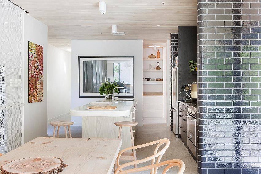 Приходилось видеть кирпичный переход на кухне от рабочей к столовой зоне. Такое структурирование смотрится эффектно.