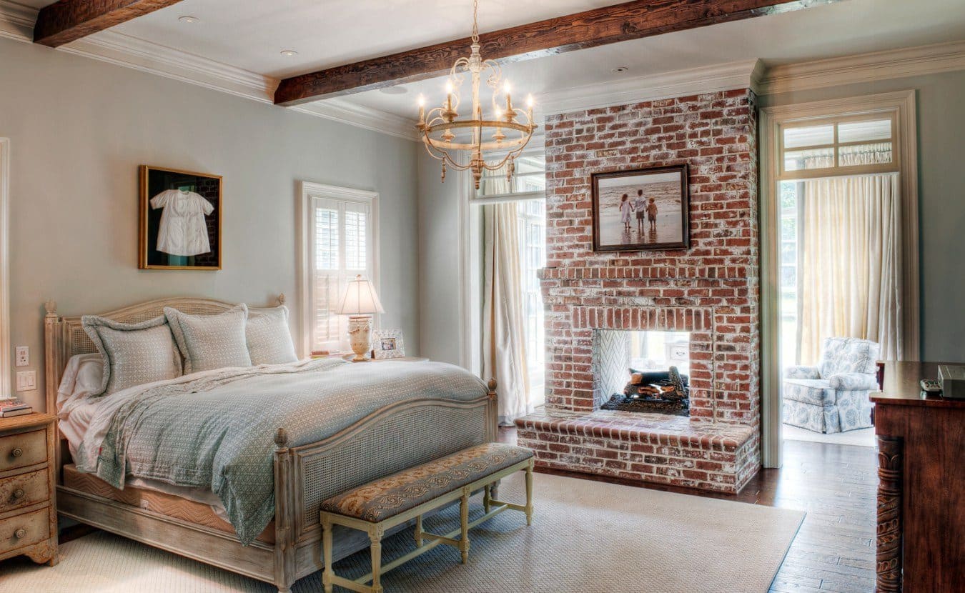 Шикарные обои из красного кирпича отделяют каминную зону от остальной комнаты и идеально сочетаются с деревянными балками на потолке