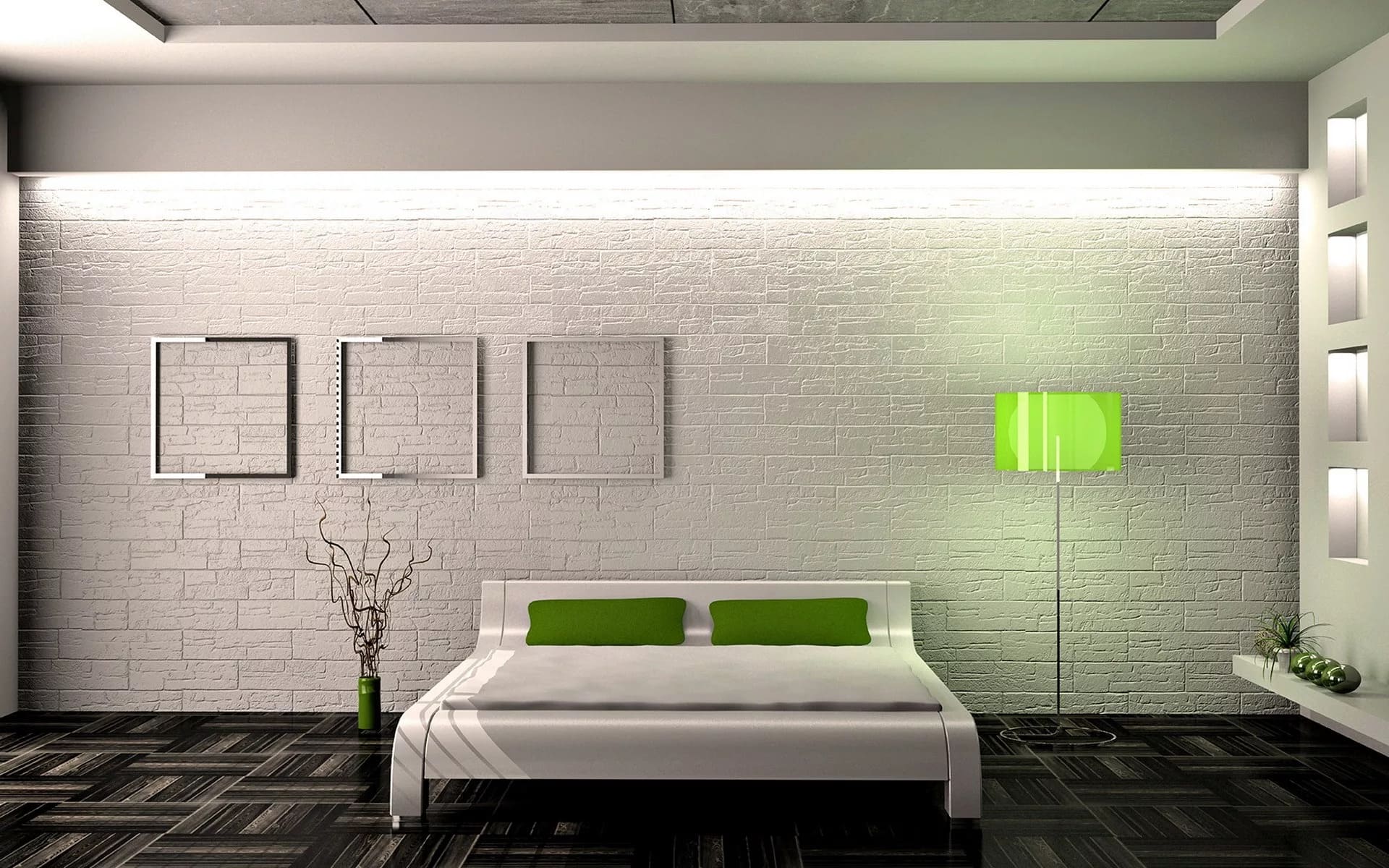 Белые кирпичные обои на акцентной стене украсят комнату, не отягощая пространство