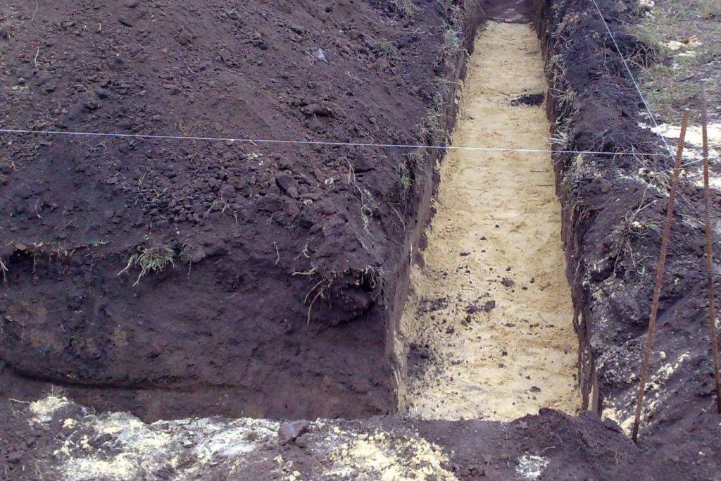 Дно траншей засыпается ровным слоем песка на высоту порядка 10-15 см. Этим создается пластичная подушка, принимающая на себя все нагрузки от грунта при его расширении или сжатии. Это делается для компенсации морозного пучения грунтов.