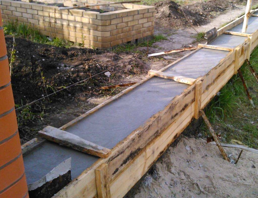 Канавки под заливку бетона должны быть со строго вертикальными стенками, кроме того, бетонное основание необходимо поднять на несколько сантиметров выше уровня земли. Для этого вдоль линии траншей устанавливается опалубка – ряд досок, которые не дадут бетонному слою растечься.