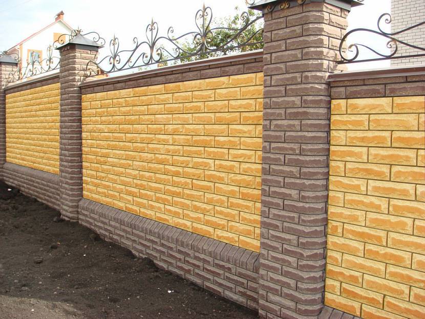 В тех случаях, когда полноценный кирпичный забор сделать вы не можете (в силу недостатка средств), можно прибегнуть к его имитации — полной или частичной. Подобные конструкции изготавливаются из полипропилена высокого класса, устойчивы к разрушительному действию внешней среды и при этом сами безопасны в экологическом, санитарном плане. Дополнительно улучшить качество специальных панелей помогает нанесение на них краски, подавляющей шелушение, выцветание, замедляющей потерю прочности.