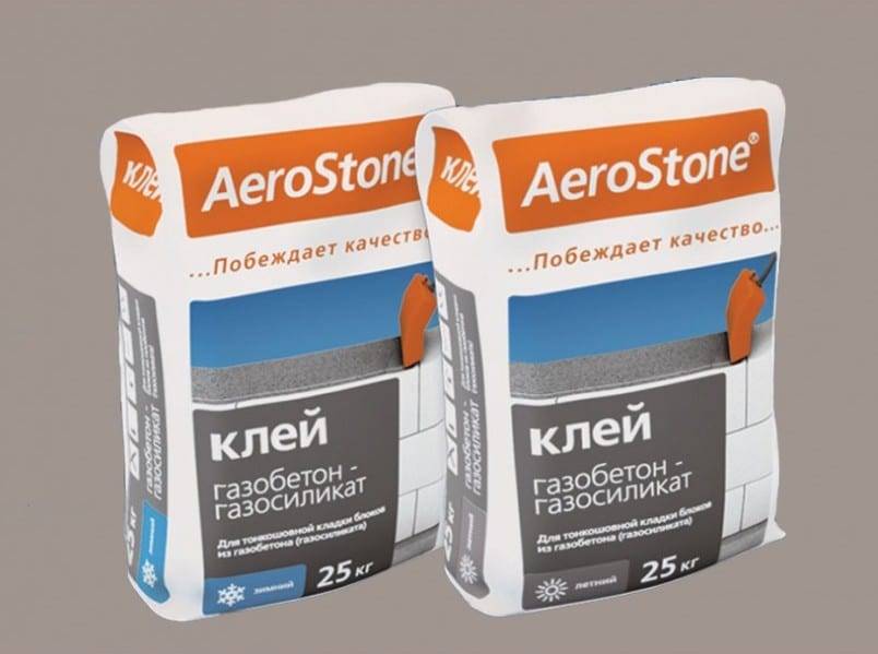 - Аэрок. Ячеистый бетон клеем этого производителя можно класть зимой и летом. Температура эксплуатации от -15оС до +35оС. Расход на кубометр примерно 15-18 кг, при нанесении 3-миллиметрового слоя.