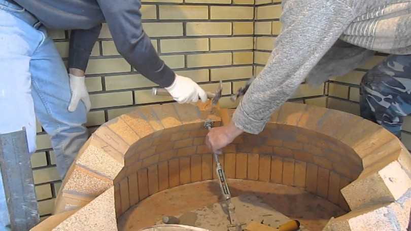 Уложив первый ряд, на него по краю кирпича выкладывают пруток. Заполняют площадку раствором с небольшим запасом, причем ближе к трубе слой делают больше. Затем, ведя кельмой по прутку, снимают излишек, очищая пруток от раствора. Но при этом уклон раствора сохраняется. Ставят кирпич, выравнивают его по уровню. При этом сильно осесть ему не дает пруток, а положение другого конца контролируем уровнем.