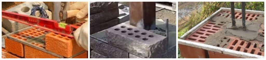Распределив раствор по фундаменту столба, сделайте первый ряд кладки. Обязательно проверьте его уровнем, в случае необходимости добавьте или наоборот удалите раствор. Сделав несколько рядов (примерно 0,5м), в полость столба укладывается арматура и заливается бетоном.