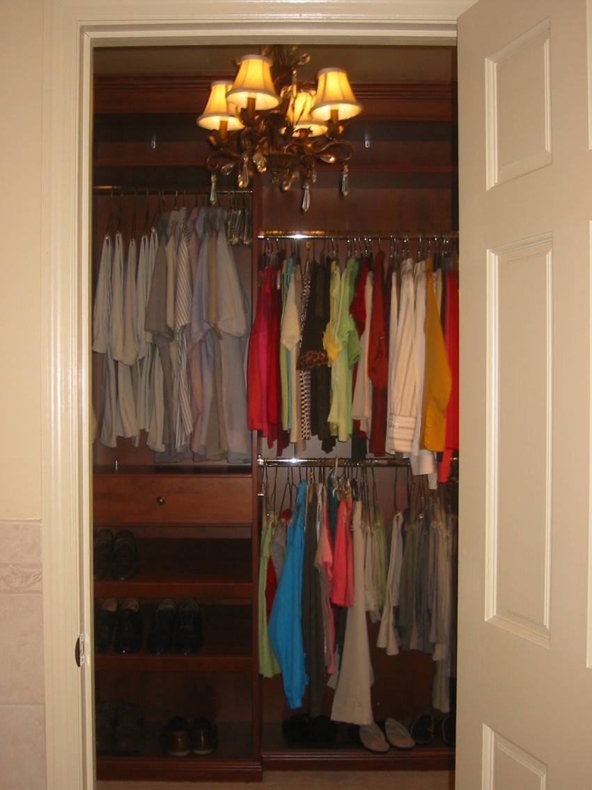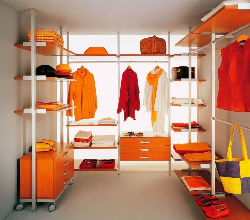 Штанги с вешалками нужно сделать так, чтобы к ним было подойти и примерить с них одежду. Ремни, шляпы и прочие аксессуары следует хранить в прозрачных пластмассовых ящиках или плетеных корзинах. Последний вариант наиболее предпочтителен, так как эти корзины пропускают воздух что не даст появиться опрелости на предметах. Для хранения зонтов и сумок, можно воспользоваться крючками.