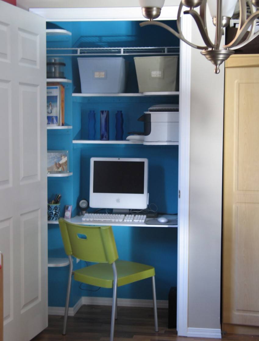 Оригинальное решение – организация в кладовке мини-кабинета. В этом случае в специальной нише размещается компьютерный стол и все необходимые офисные принадлежности.