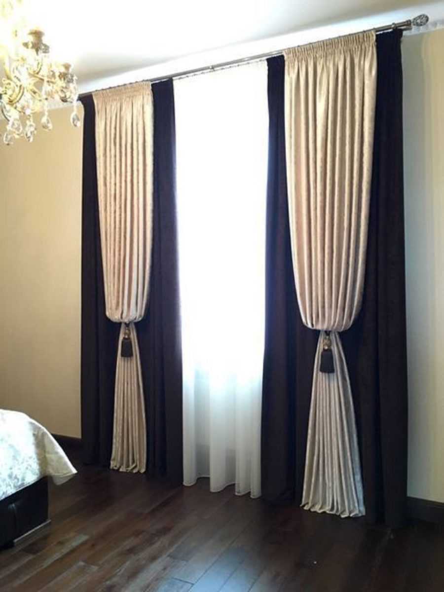 Классические шторы выполняются из двух видов ткани, различающихся плотностью и цветом. Для нижнего полотна выбирают тюль или органзу, верхние слои предпочтительно делать из гобелена, сатина или атласа.