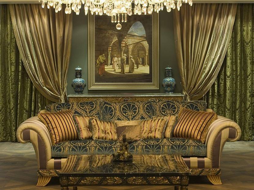 Классический стиль характеризуется использованием тканей и материалов самого высокого качества. Пол должен быть изготовлен из мрамора или деревянного паркета и дополнительно покрыт персидским ковром. Эти элементы могут быть успешно заменены мраморной плиткой для пола и ковром хорошего качества, сотканным с цветочными мотивами.