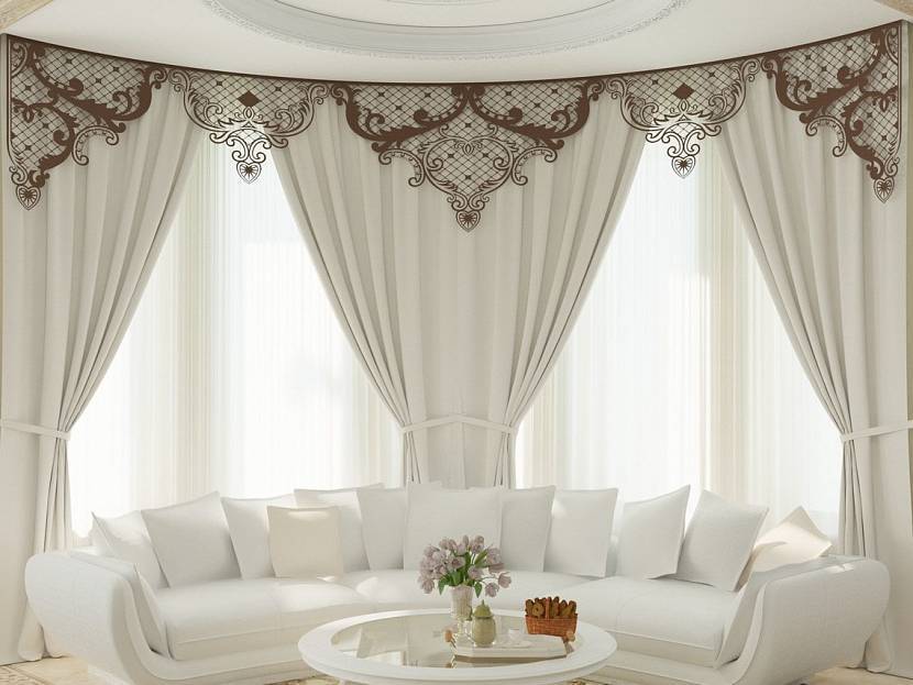Для гостиной прекрасно подойдут роскошные складки оформления во французском стиле или шикарный ламбрекен с простыми полотнами.