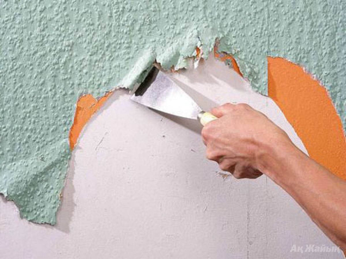 Побелку нужно смыть теплой водой, водоэмульсионное покрытие снимается шпателем. Выбоины и трещины рекомендуется заделать, иначе эти дефекты будут проступать сквозь обои. Если потолок уже был оклеен обоями, то нужно полностью от них избавиться и смыть остатки старого клея теплой водой.