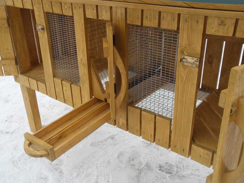 Если пол сетчатый, то стены зимой быстрее промерзают, зато в летнее время отлично проветривается. Пол из сетки с крупными ячейками травмоопасен, зверьки застревают в них лапками, и могут примерзнуть к нему в холода. Поэтому, ячейку делят на два отсека: кормовой и гнездовой.
