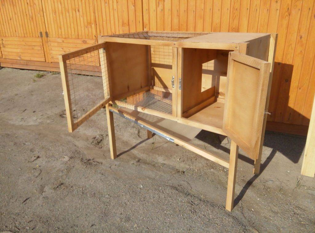 Понадобиться изготовить две боковые деревянные стенки 0,7×0,7 м, заднюю — 1×0,5. На дно прибить рейки, а поверх сетку. Передняя дверца и крыша на петлях тоже делаются из сетки. Желательно снабдить верх кроличьего домика ручкой. Под основную ячейку устанавливается поддон.