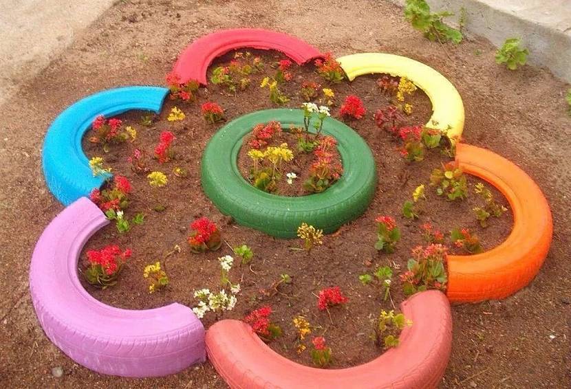 - Цветик-семицветик. 4 покрышки покрасить в разные цвета. 3 шины разрезать пополам, а 1 оставить целой. В центр уложить целую покрышку, а вокруг нее по кругу уложить половинки оставшихся, формируя лепестки.