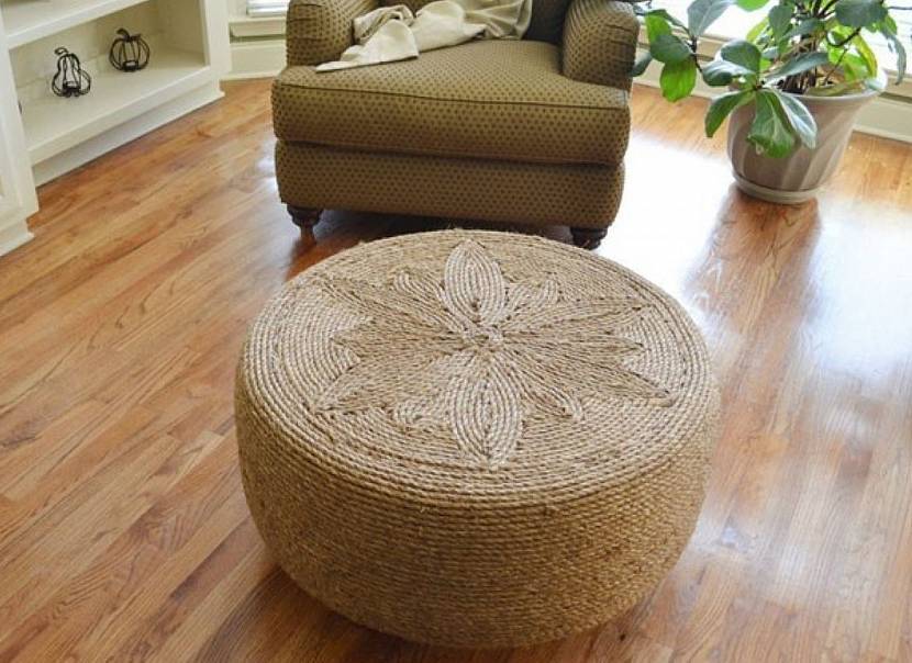 Миниатюрную мебель из одной шины декорируют грубой бечевкой. Приклеивают конец веревки в центре сиденья, аккуратно увеличивают украшение по спирали. Витки продолжают по бокам шины. Чтобы нитки не размотались и не боялись влаги, надо покрыть изделие бесцветным лаком. Если снизу зафиксировать миниатюрные колесики, то элемент легко перемещать в помещении.