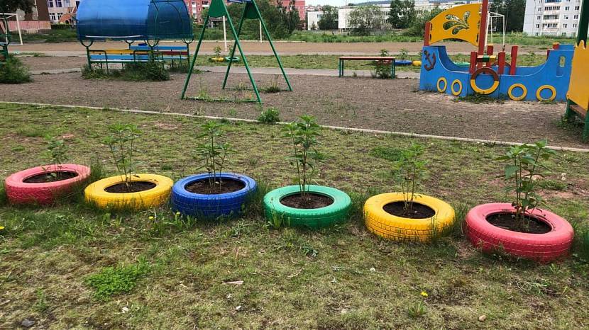 После этого их, закапывая на несколько сантиметров, укладывают в форме цветка: целую покрышку в центр, половинки на некотором расстоянии от нее по кругу, одна к другой, протекторами наружу. Получается своеобразная ромашка.