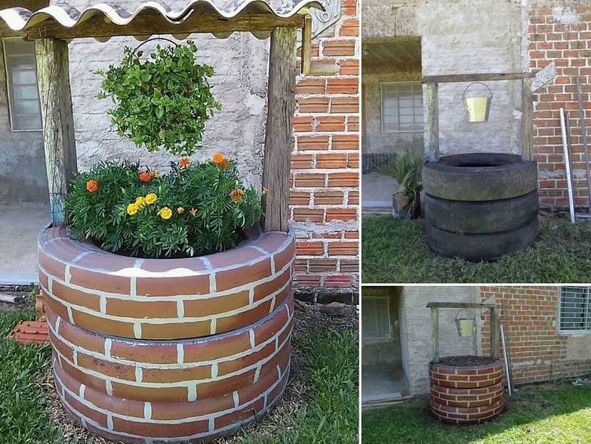 Декоративный колодец – это необычное решение для размещения растений. Три шины одинакового диаметра фиксирую горкой на столбиках. Через палки протягивают опоры, на которых крепят крышу. Резиновую поверхность выкрашивают под кирпич. Цветы располагают в «ведре» и в центре клумбы.