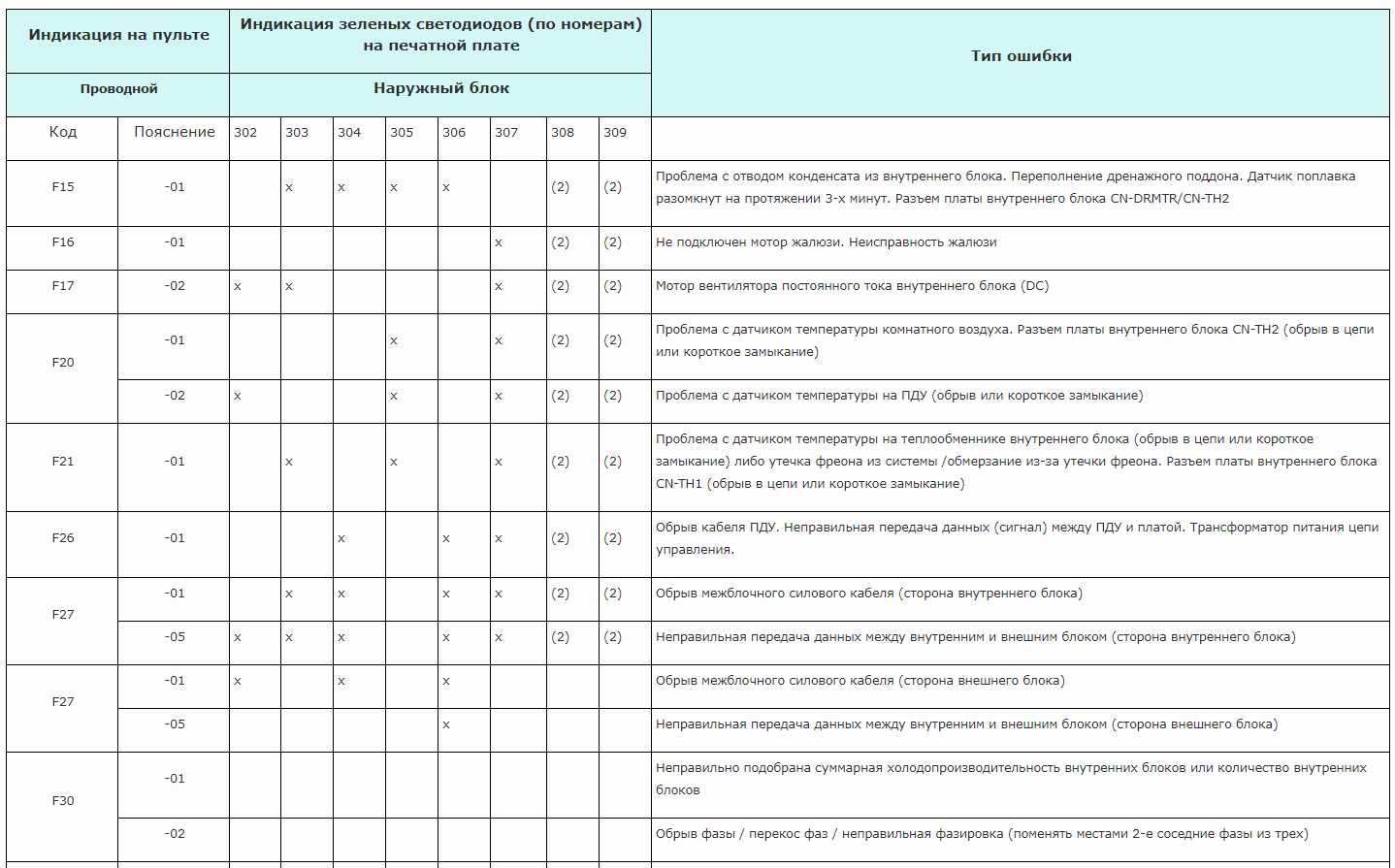 Ниже приведены некоторые коды, показывающие обрыв или выход из строя контрольных устройств, реле, датчиков, что делает управление кондиционером невозможным. Явный признак того, что потребуются запчасти для замены.