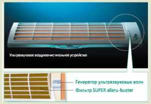 - внутренний блок некоторых моделей (зависит от маркировки) оборудован системой очистки E-Ion. Ее датчики контролируют состояние воздуха, при загрязнениях включается генератор заряженных ионов, убивающих плесень и грибковые споры. Когда датчик показывает приемлемое качество воздуха, система E-Ion отключается и таймер сигнализирует о проблеме. Нетрудно понять, что оповещение может свидетельствовать как о том, что необходим ремонт датчика или генератора, так и о том, что просто пора чистить фильтры;