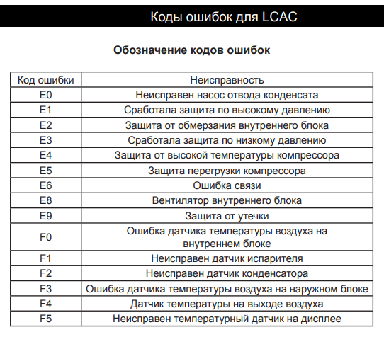 Ошибки на дистанционном пульте кондиционера