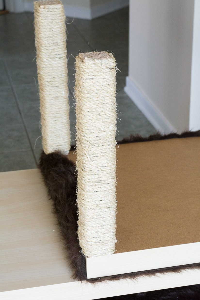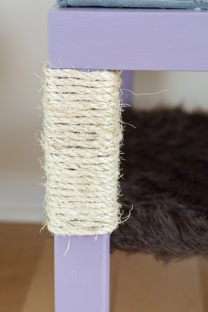 Теперь черед самой когтетки. В нашем проекте обернуты две ножки верхней конструкции и половина ножки внизу. Вы можете сделать столько когтеток, сколько пожелаете. Чтобы закрепить сизалевый канат вокруг ножки, также используем степлер.