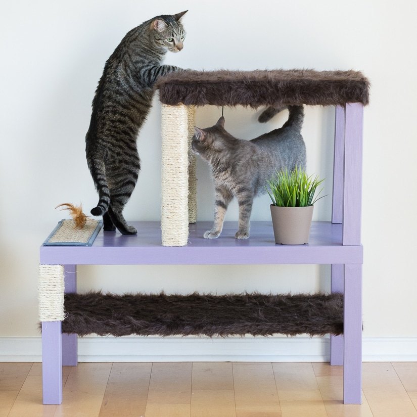 Материалы: кофейный столик; тумбочка; сизалевая веревка; степлер; клей; кусочек ткани из искусственного меха; краска; игрушки для кота (кстати, вы можете посмотреть, как сделать игрушку для котёнка своими руками на нашем сайте).
