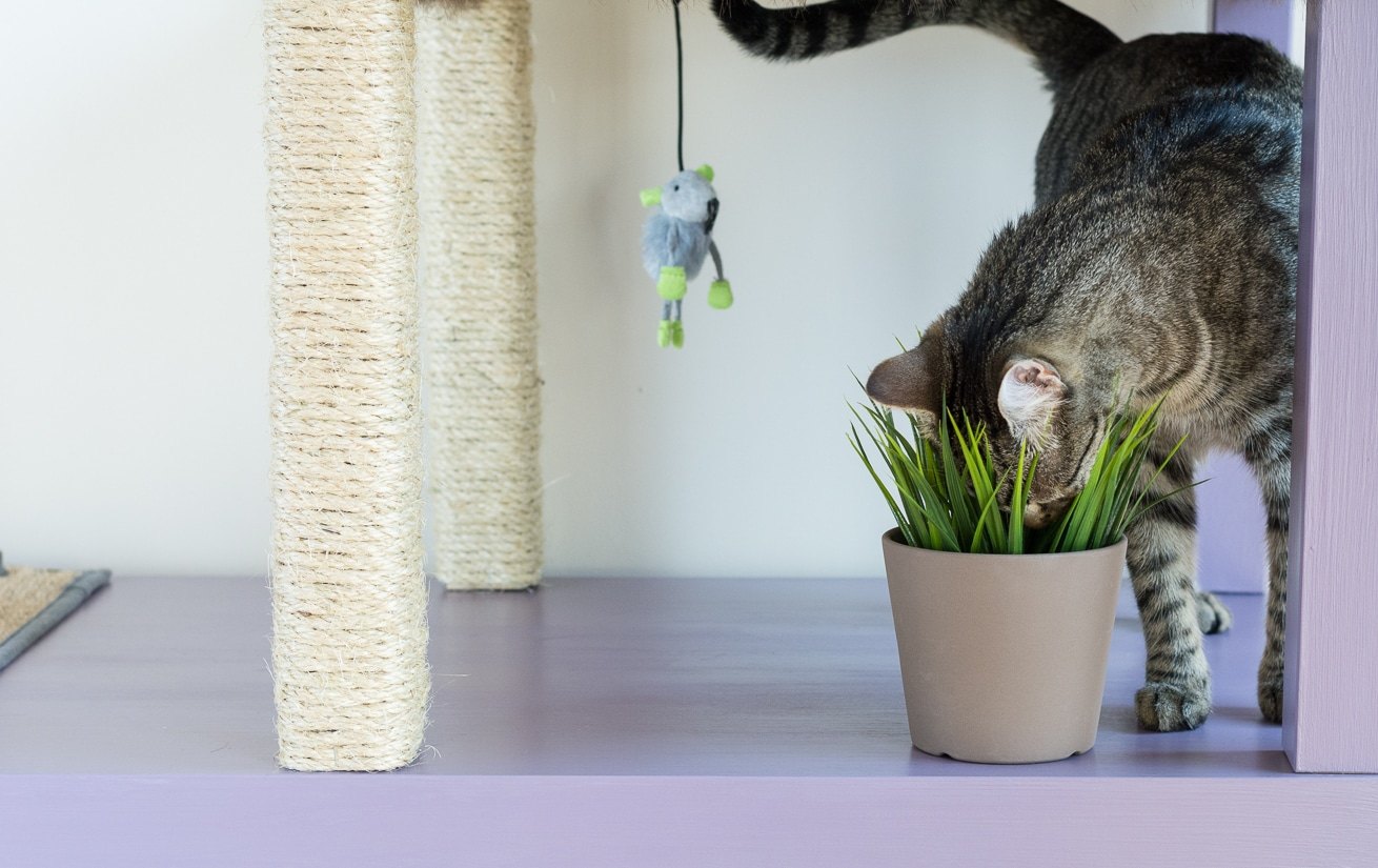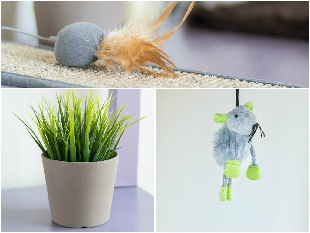 И в завершении проекта декорируем игрушками для котят, также можно поставить горшочек со специальной зеленой травкой, которую они так любят пожевать.