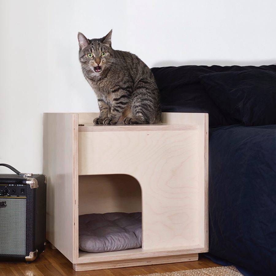 Если в вашем доме проживает не одна кошка, а целая кошачья династия, одним спальным местом обойтись не получится. Неплохой вариант в этой ситуации двухъярусная деревянная кровать. Смотрится такая модель очень необычно, и вполне сможет украсить любой интерьер.