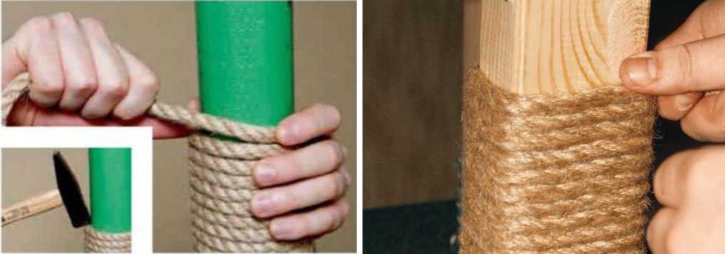 Последний этап — обматываем столбы, делая когтеточку. Закрепить веревку к столбу проще всего скобами. Несколько скоб — и готово. Далее, плотно прижимая один виток к другому, по спирали обматываем столбы. Доходим до преграды, снова закрепляем веревку скобами и продолжаем на следующем участке.