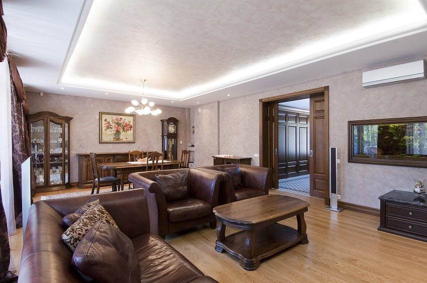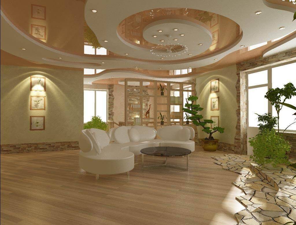Для начала подумайте, какое настроение в зале вы бы хотели создать. От этого зависят критерии выбора цвета, материала и стиля. Какой бы вы хотели видеть комнату? Какие эмоции она должна вызывать у посетителей? Задумайтесь над этим вопросом прежде чем подбирать дизайн потолка в гостиной.