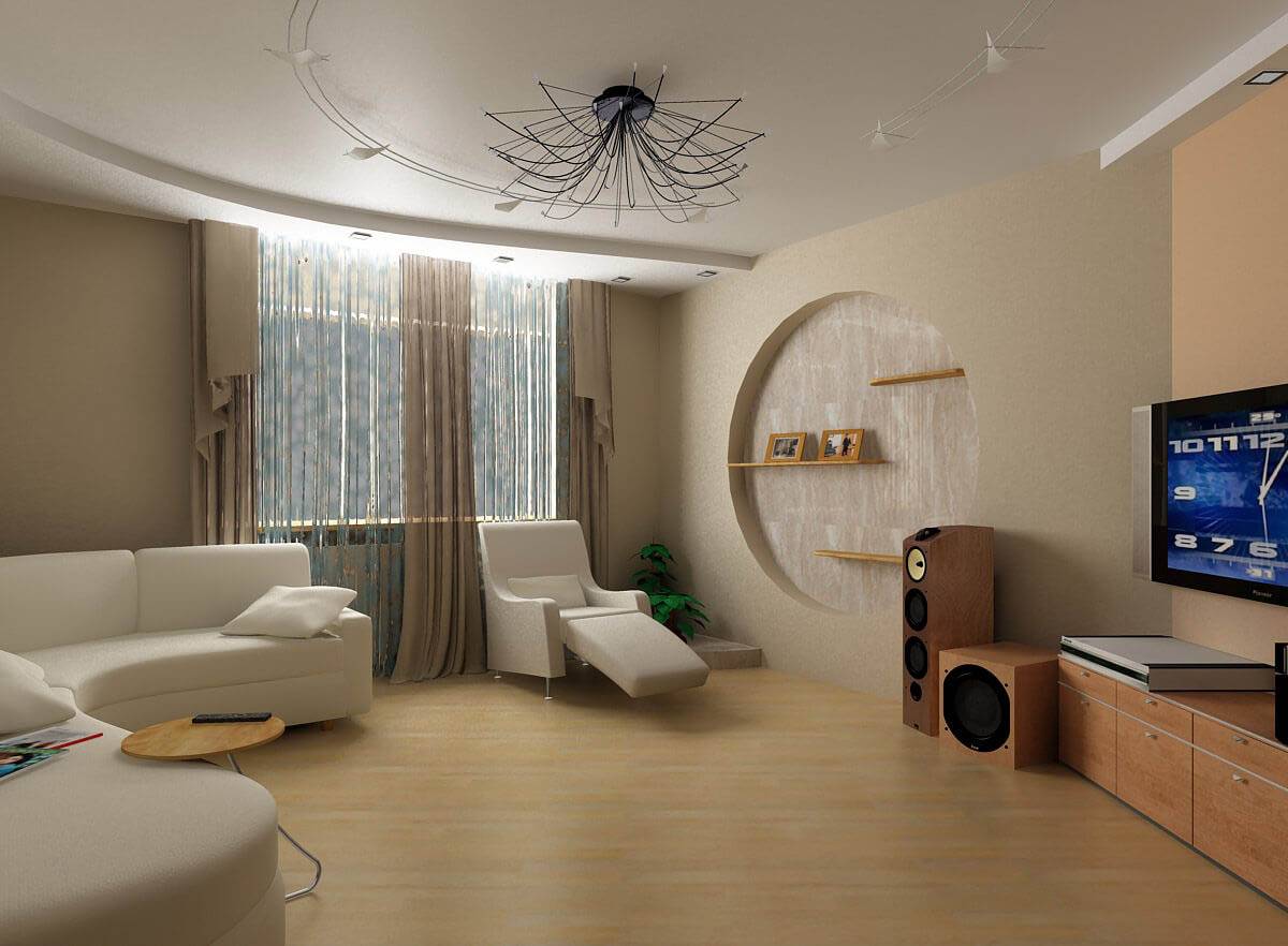 Определитесь с общим стилем зала. Естественно, этот фактор влияет и на внешний вид остальных неотъемлемых частей общей картины. Его оформление должно соответствовать направлению всей комнаты.