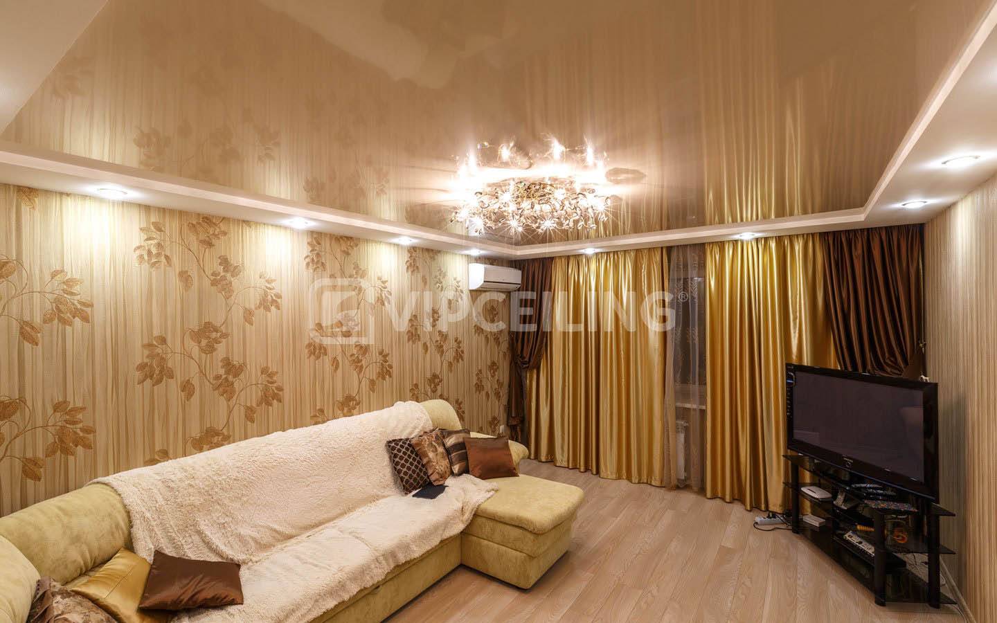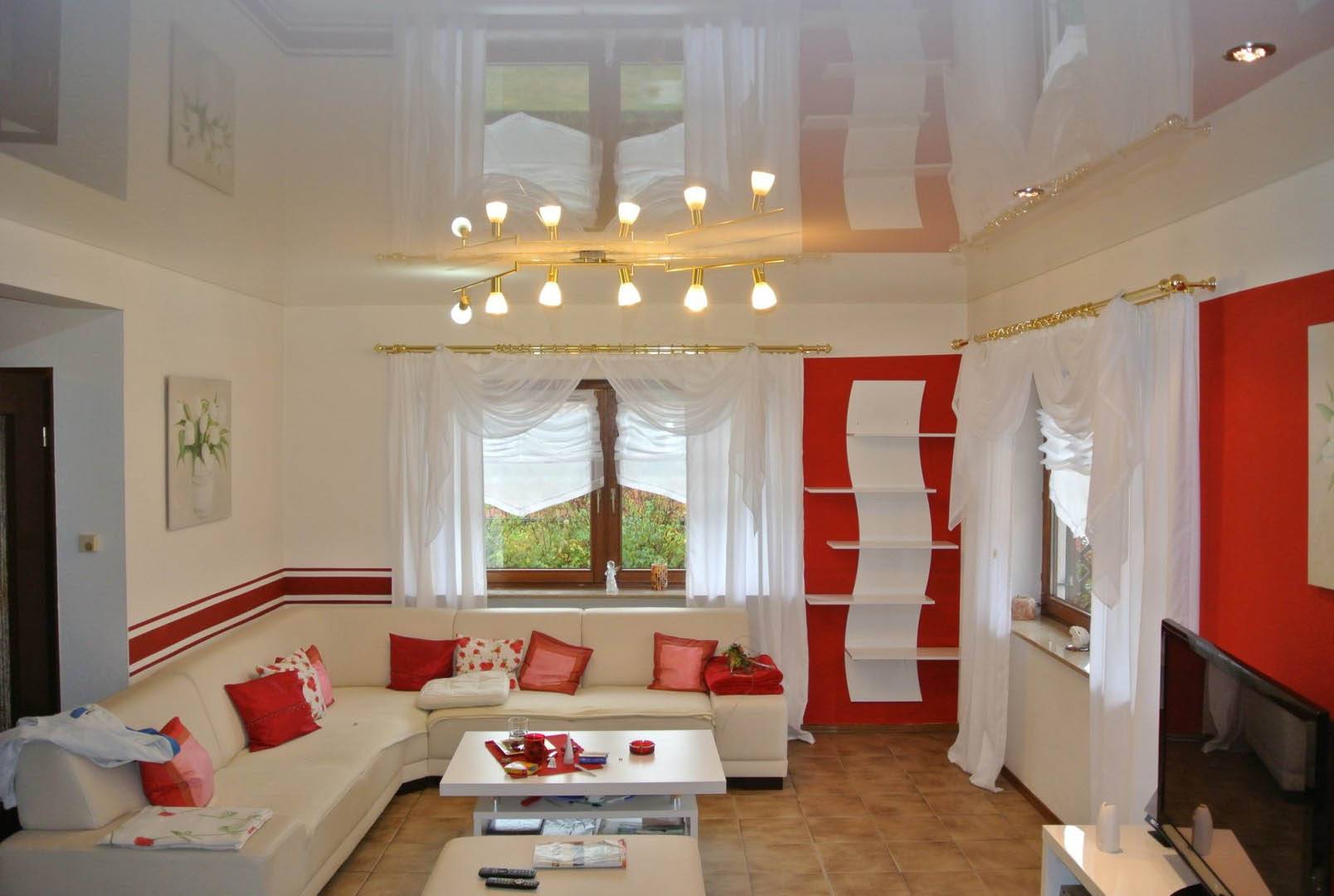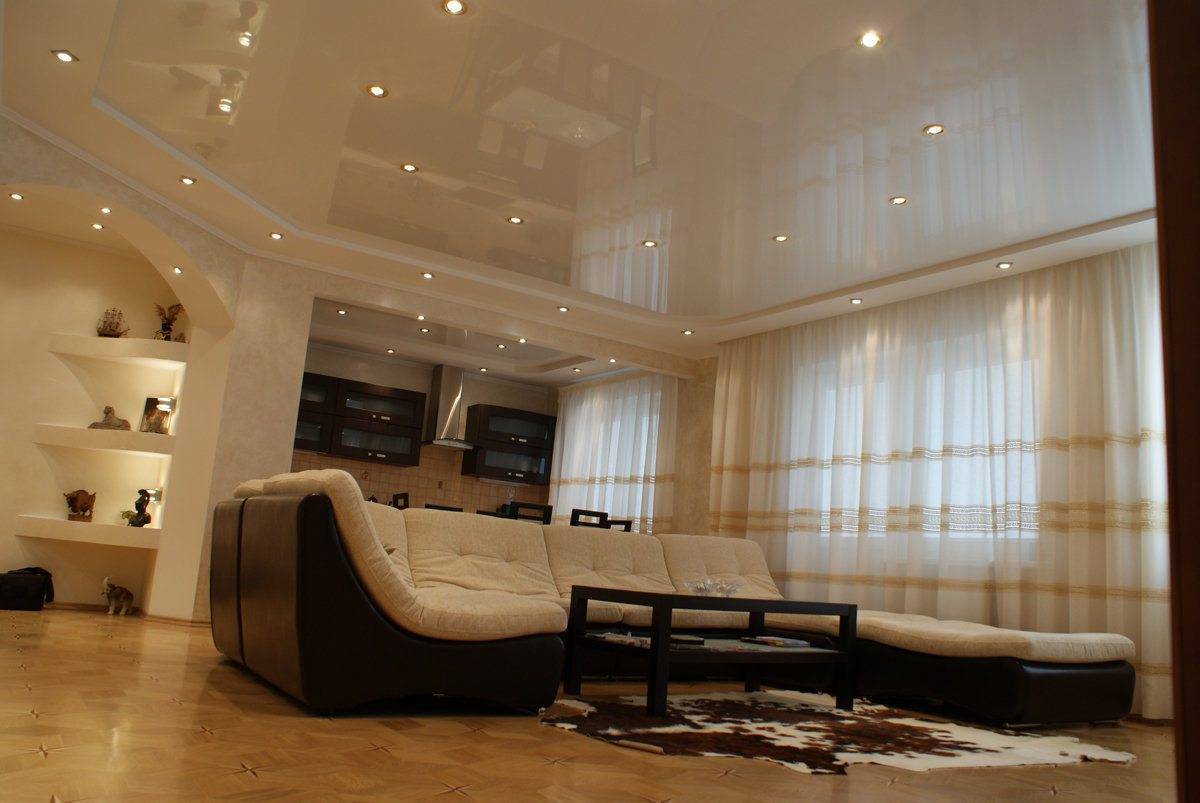 Глянцевые натяжные потолки в зале, конечно, всегда смотрятся выигрышно.