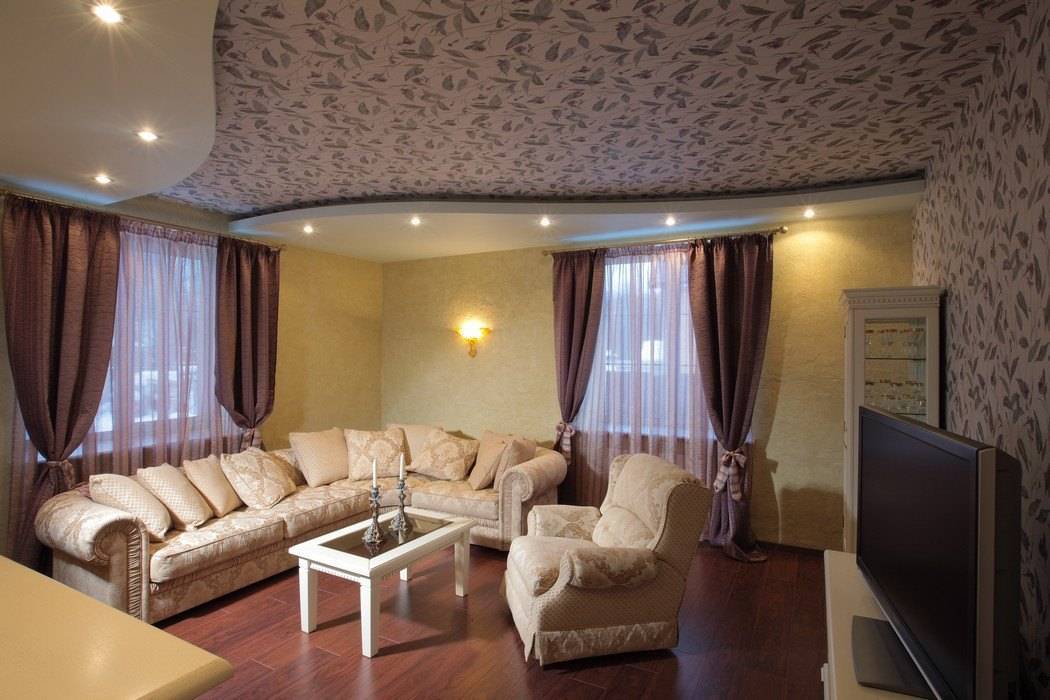 Современный потолок дает много возможностей в дизайне интерьера. Данная плоскость гостиной может быть эффективно выделена. Благодаря современным материалам и технологиям легко сделать декоративные подрезы, углубления, отверстия, узоры или разные уровни. Стильный дизайн интерьера создаст неповторимую атмосферу.