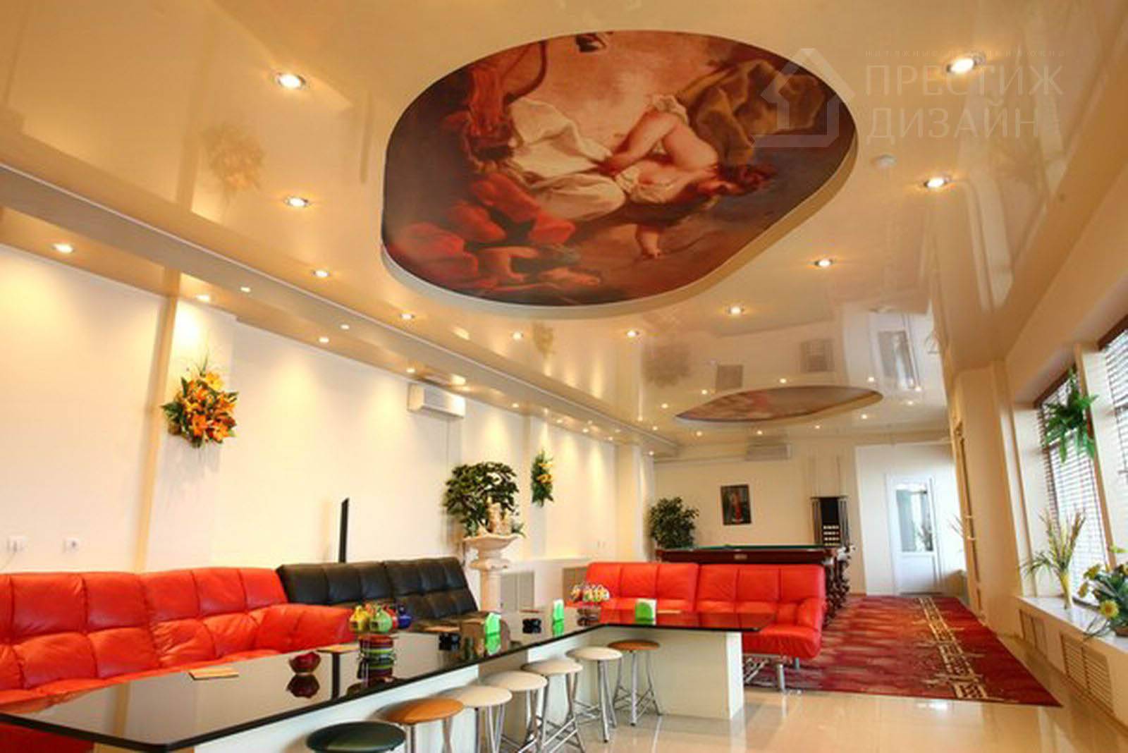 Преимущества использования натяжных потолков в зале наглядно демонстрируют примеры дизайна современных интерьеров на фото. Остановимся подробнее на вариантах натяжных потолков с фотопечатью. По сути, это мощный инструмент для создания запоминающихся выразительных дизайн-проектов, повторить которые в формате другого интерьера – практически невозможно. Часто фотопечать в зале используется именно на тканевых потолках, создавая впечатление невероятно дорогого и эффектного полотна с глубоким и подчеркнутым объемом.
