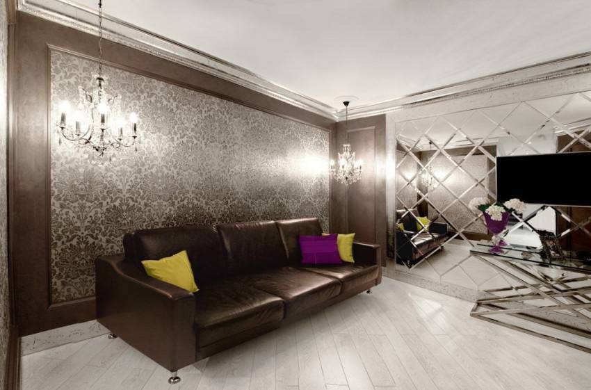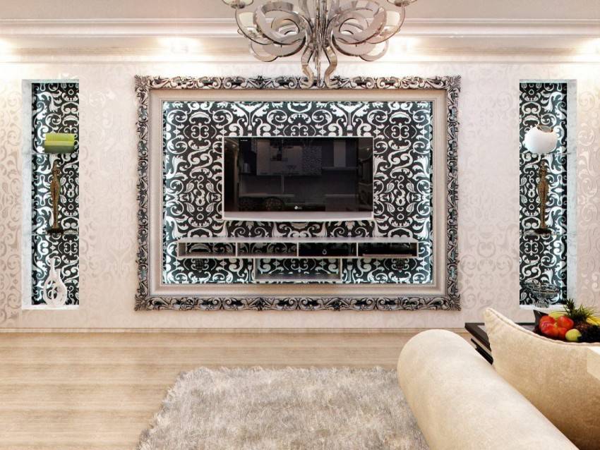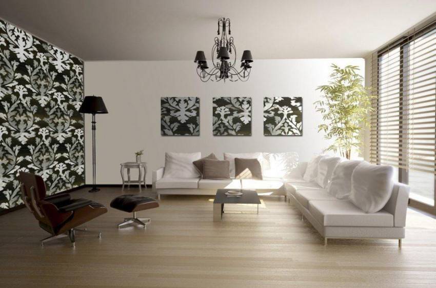 Использование импровизированного декоративного панно, для создания которого были взяты дорогие, роскошные дизайнерские обои, также позволяет создавать интересные декоративные акценты в помещении. Гостиная с таким акцентом обычно имеет значительную площадь, поскольку сам декор принято делать довольно крупным.