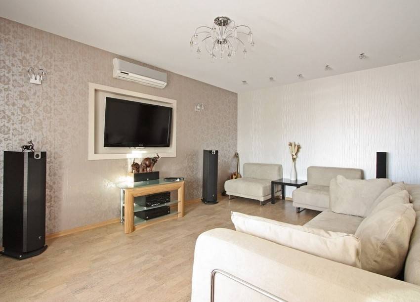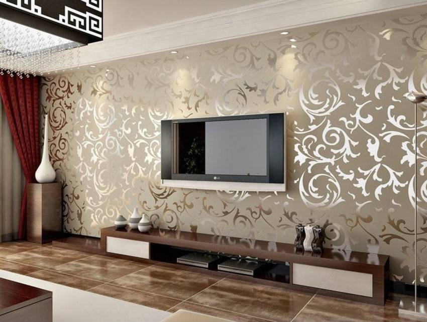 Вертикальное комбинирование в гостиной уместно со вставками обоев с рисунком совместно с однотонным партнером.