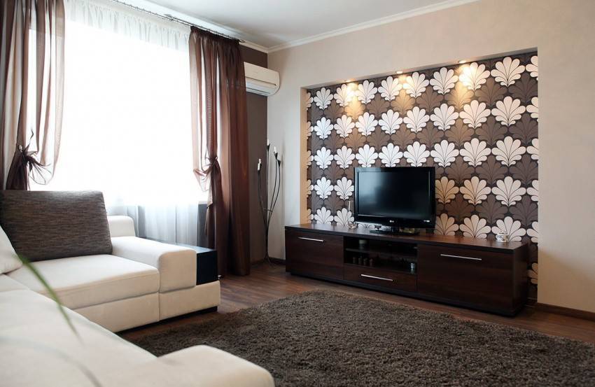 Если при помощи панно оформляется ТВ-зона или ниша, в которой установлен фальшкамин, колонны, здесь используются глубокие, сложные цвета, матовые текстуры. Интересно выглядят при таком комбинировании обои с имитацией натурального камня, голого бетона, кирпича.