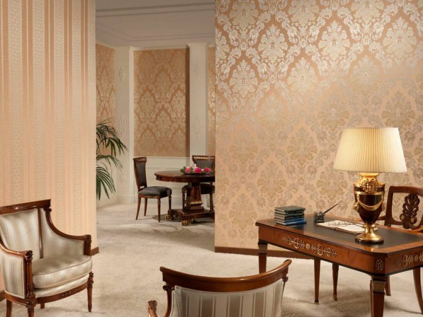 Светлые обои с вензелями – элемент умеренных интерьеров, подходят для оформления помещения в классическом стиле.
