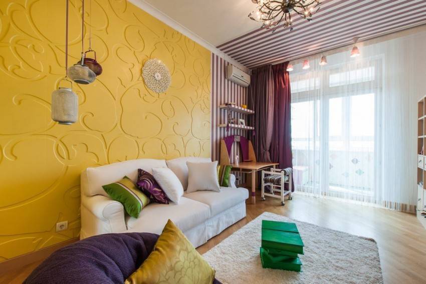 Сделайте сочетание обоев гладких и с рельефной поверхностью, глянцевых — с матовыми. Чтобы переход от одной фактуры к другой не бросался резко в глаза, можно оформить его декоративными специальными лентами или бордюрами. Переход от нижнего уровня к верхнему будет гармоничным, а в интерьере появится дополнительная изюминка.