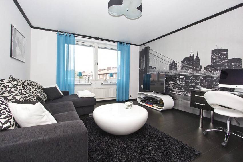 Часто в дизайне интерьеров встречается прием, где одна из четырех стен комнаты выполнена активным акцентирующим принтом, тогда как 3 другие однотонные. Такой прием хорош для любой комнаты. Так можно выделить обеденную зону на кухне, стену, у которой стоит диван в гостиной или кровать в спальне, игровую зону в детской. Причем использование фотообоев во всю стену тоже очень уместно.