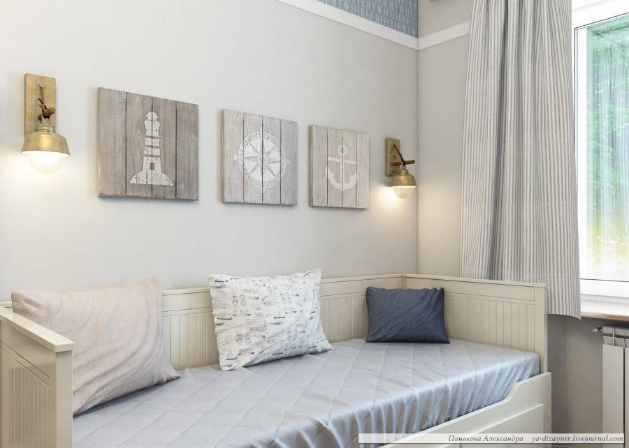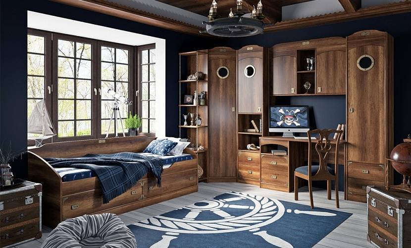 Хороший вариант для романтиков, поклонников пиратства и тех, кто хочет стать моряком. В таком дизайне комнаты для подростка используется мебель из натурального дерева или МДФ, окрашенная в коричневый оттенок. В интерьере обязательно присутствуют элементы синего или голубого цвета – занавески, покрывала, ковры, мягкие кресла или другие предметы. Одну из стен, потолок или пол стоит украсить масштабным изображением парусника или штурвала. Мелкие детали, например, ручки шкафов или ножки светильников, могут быть выполнены в виде рыбок, чаек или якорей.