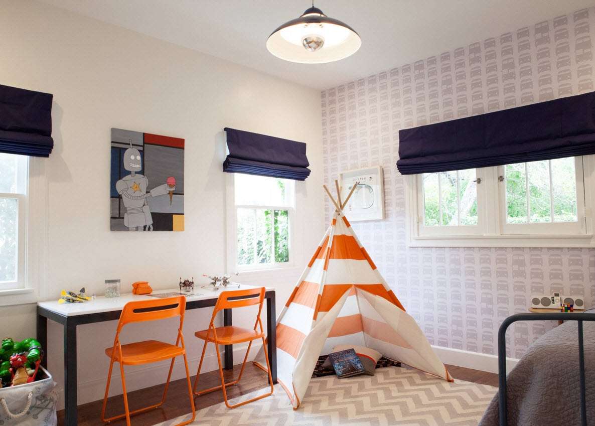 Если речь идет про обустройство детской комнаты для мальчика, то отлично подойдут яркие цвета. Например, синий, зеленый, красный, голубой и другие. Интересным вариантом является их сочетание. Это позволит выделить отдельные зоны в комнате. На стене, которая находится с местом отдыха, лучше расположить спокойные тона.
