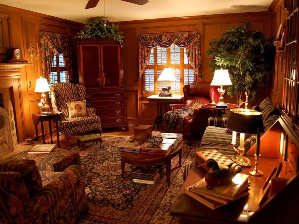 Выглядит примерно таким образом: по центру камин, который дополняется мебельным гарнитуром. Наличие книжного шкафа или библиотечных полок, которые занимают одну из стен во всю длину, широту и высоту. Если потолки очень высокие, а книги находятся на самом верху – используют лестницу, которая тоже должна быть выполнена в характерном стиле.