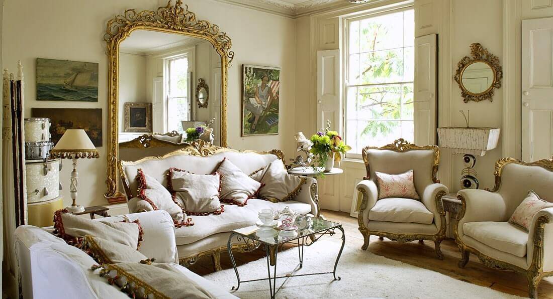 Рейчел Эшвилл говорит, что, реставрируя мебель, большое внимание уделяла обивочной ткани, предпочитая лен и хлопок, тик, батист и атлас с сентиментальными принтами: розами, венками и виньетками, ангелочками.Какая шикарная жизнь без камина? Правильно, никакой, поэтому «господин» гостиной – небольшой, украшенный лепными завитками камин изящного, однако, ненового вида.Обязательные атрибуты также – комфортабельное кресло в просторном, богато убранном чехле, и, конечно, диван – элегантных пропорций, на грациозных, отделанных резьбой опорах