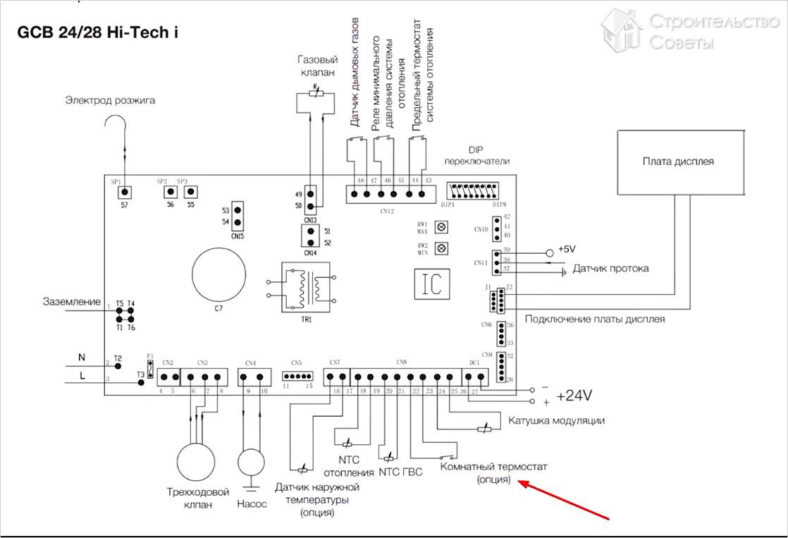 В схеме газового котла должно быть указано, есть ли возможность подключения к нему термостата