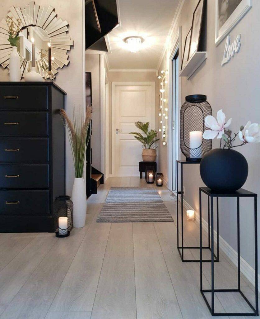 Если тебе повезло с большой и достаточно светлой прихожей или просторным объединенным помещением, смело бери черный цвет. Такие интерьеры всегда смотрятся дорого, стильно и эффектно, а на темном фоне по-новому играет деревянная мебель. Чтобы комната не была слишком мрачной, позаботься о светлых акцентах и достаточном количестве света.