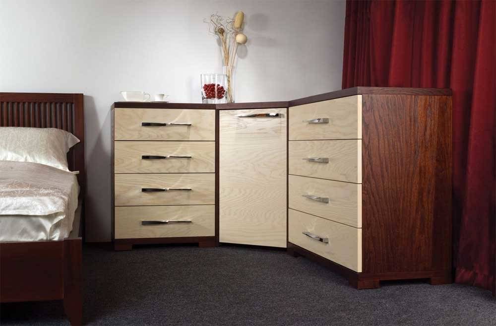 Угловые комоды, которые появились благодаря современным схемам расположения дверок и шкафов, считаются наиболее вместительными, при том, что занимают небольшое пространство.