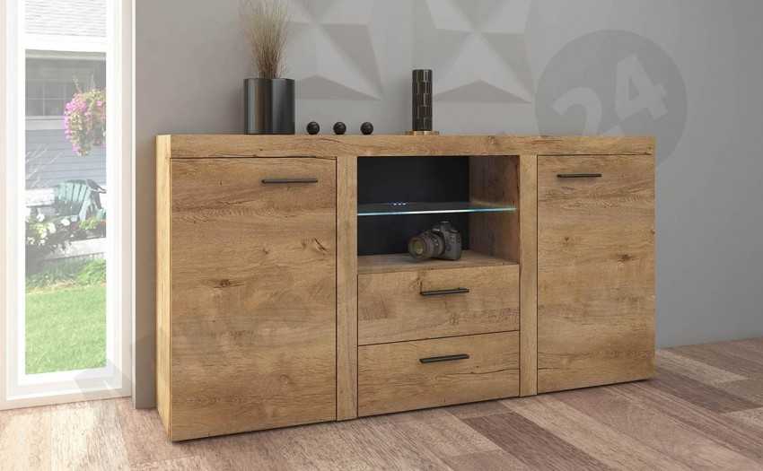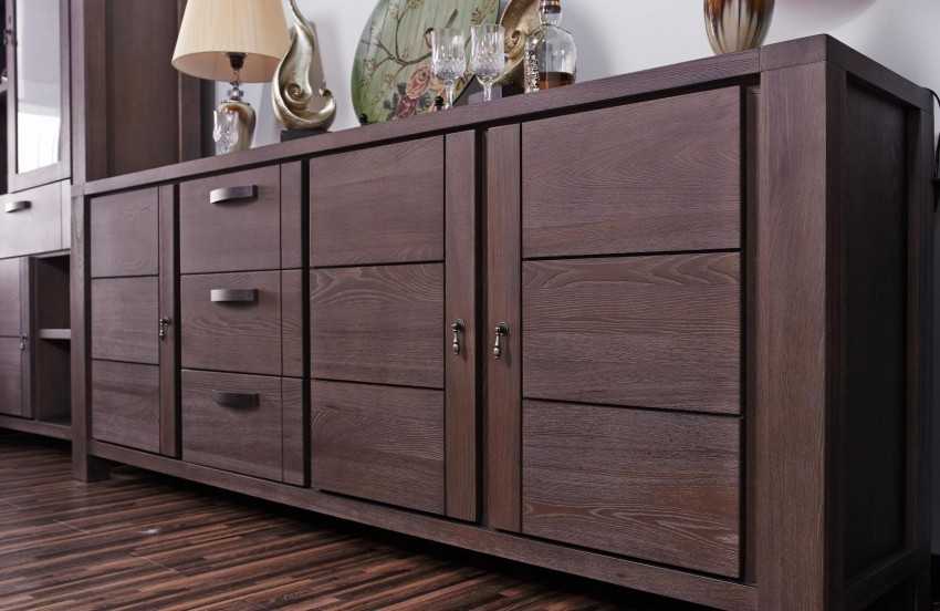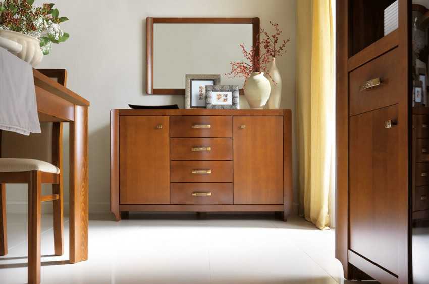 - натуральной древесины — данный материал является экологически чистым и оптимальным для установки в любом жилом помещении. За счет способности материала «дышать», обеспечивается прекрасная вентиляция внутреннего пространства такого изделия. Дополнительно изделия из древесины считаются прочными и надежными. Для создания комодов обычно используется сосна и клен, а также бук или вишня. От выбранной породы древесины зависят эксплуатационные параметры самого изделия. Если требуется высокая прочность, так как предназначается комод для посуды, то желательно, чтобы он был сделан из бука. Если нет возможности выделить на покупку много средств, то выбирается конструкция из сосны;